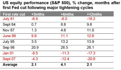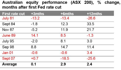 The US share market rose over the subsequent 3, 6 and 12 months after the commencement of 5 of the last 8 Fed easing cycles. The exceptions were after the rate cuts in 1981, 2001 and 2007 which were associated with recessions.