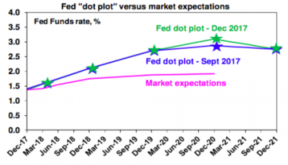 Market expectations for just two Fed rates in 2018 hikes remain below the Fed’s dot plot signal of three hikes. While the market has been right in expecting lower interest rates than the Fed has been signalling in recent years, it wrongly underestimated the Fed in 2017 and is likely to do so again 2018. I suspect that the risks for US inflation are now swinging to the upside with spare capacity in the US economy gradually diminishing. So just as the market proved too cautious in allowing for just two Fed hikes this year when it has actually done three, we suspect it will be surprised again next year. In fact, given our views of a pick-up in inflation risks, we are allowing for four rate hikes next year in 2018 (conditional on tax reform being passed).