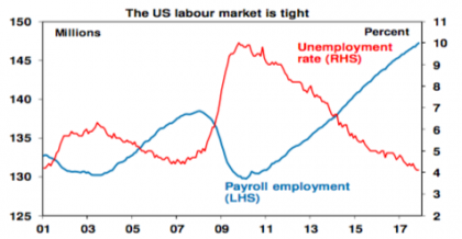 The risks around inflation in the US are rising. The US labour market is even tighter than it was a year ago with most indicators pointing to very tight conditions – unemployment near 4%, ultra-low jobless claims, very high hiring and quits rates, business surveys indicating high employment plans, etc – and anecdotal evidence continuing to point to rising wages. Sooner or later this will show in higher official wage data with some flow on to inflation. Upstream price pressures are also building, which is evident in a rise in core producer price inflation from just 0.3% year on year two years ago to 2.4% now.