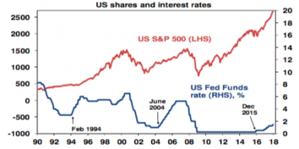 Third, US economic downturns have historically only come three years after the first Fed rate hike in a tightening cycle. And it’s likely to be even longer this time as it’s only when monetary policy becomes tight after numerous hikes that the economy gets hit and we are still a long way from that – so the gradual nature of the rate hikes so far could stretch it out further. In the last tightening cycle in 2004-2006, rates rose 17 times in just over two years – now they have only gone up five times over two years and from a much easier base. Shares often have wobbles around the first rate hike – as we saw in second half 2015 and early 2016 – but again, sustained problems usually only set in when monetary policy has become tight. This can be seen in the next chart. Shares had wobbles when interest rates first started to move up in February 1994 and in June 2004. Thereafter they resumed their rising trends and bear markets did not set in till 2000 and 2007 after multiple hikes and with recessions looming. Again, we are a long way from that.