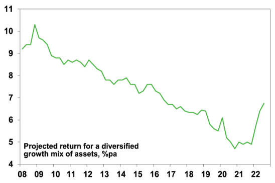 At their recent low point the RBA’s official cash rate fell to 0.1%, average bank 1-year term deposit rates fell to 0.25%, 10-year bond yields fell to 0.6%, gross residential property yields fell to 2.2%, commercial property yields fell below 5%, dividend yields fell below 4% for Australian shares (with franking credits) and just 2% for global shares. The problem was that with the cash rate and bond yields around zero there wasn’t much further for yields to keep falling. This saw our assessment of nominal medium term return projections for a balanced growth mix of assets fall below 5%. The good news is that with yields on cash, bonds and shares now up and asset prices down their return potential has improved.