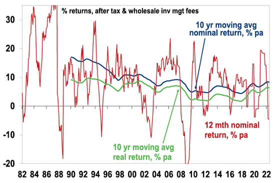 The start of this year has been painful for investors with sharp losses in shares and bonds, dragging most superannuation funds into negative returns for the last financial year. And yet despite this setback and rough patches in 2015, 2018 and in early 2020 with pandemic lockdowns, median balanced growth superannuation funds returned 8.4% pa over the 10 years to June after fees and taxes. While dull compared to the double digit returns of the 1980s and 1990s, it’s pretty good once low average inflation of 2% pa over the last decade is allowed for.