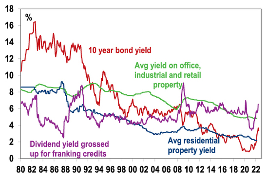In the early 1980s, the RBA’s “cash rate” was around 14%, 1-year term deposit rates were nearly 14%, 10-year bond yields were around 13.5%, commercial and residential property yields were around 8-9% and dividend yields on shares were around 6.5% in Australia and 5% globally. This meant investments were already providing very high income so only modest capital growth was needed for growth assets to generate good returns. And then with the shift from very high inflation in the early 1980s to very low inflation up until recently, the last 40 years saw a collapse in yields. This was led by falling interest rates and then yields on other assets were pushed down too. See the next chart. Consistent with the explanation in the previous section this led to strong average returns for diversified investors through the last 30 or 40 years, despite periodic setbacks like the 1987 crash, the tech wreck and the GFC.