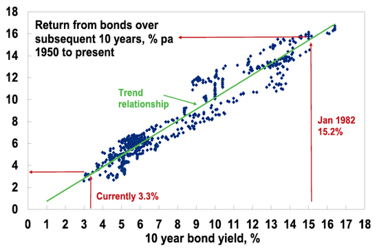 For bonds, the best predictor of future medium-term returns is current bond yields – as can be seen in the next chart. If a 10-year bond is held to maturity its initial yield (3.3% right now in Australia) will be its return over 10 years. This is still low historically but well up from a low of just 0.6% in 2020.