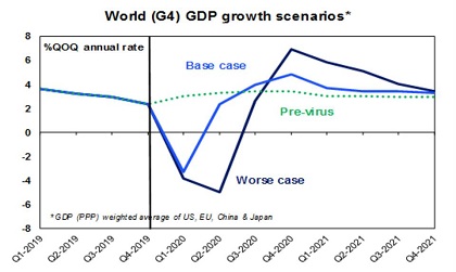A worse case downturn that sees global growth contract in the March quarter (led by a sharp contraction in China) and the June quarter as (as developed countries get badly hit) resulting in a global recession to be then followed by a rebound as life returns to normal led by China.
