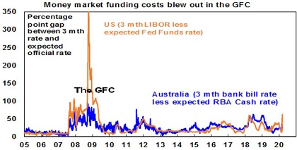 Measures of market stress, eg, bank funding costs as measured by the gap between 3-month rates and central bank rates. These have risen but are well below GFC levels.
