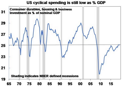 Numerous growth slowdowns and recession scares – notably around 2011-12, 2015-16 and since last year – and post GFC caution have kept this expansion slow. A key lesson of past economic expansions is that “they do not die of old age, but of exhaustion”. The length of economic expansions depends on how quickly recovery proceeds, excess builds up, inflation rises and the central bank tightens. The current US economic expansion may be long, but it has been slow. As a result, it’s been taking longer than normal for excesses that precede recessions – around cyclical spending, debt and inflation – to build up. First, cyclical spending in the US as a share of GDP remains low. In particular, there has been no “boom” in spending on consumer durables, business or housing investment resulting in a glut that needs to be worked off as occurred prior to all of the recessions in the last 50 years. All are around or below long-term averages as a share of GDP, in contrast to highs seen prior to past recessions. Basically, no boom = no bust!