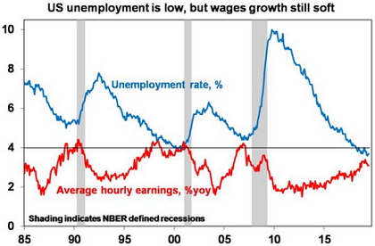 Finally, there is no sign of the surge in inflation that traditionally precedes recessions. Sure, the labour market has been flashing warning signs with unemployment and underemployment having fallen sharply, warning of a wages breakout and inflation pressure.