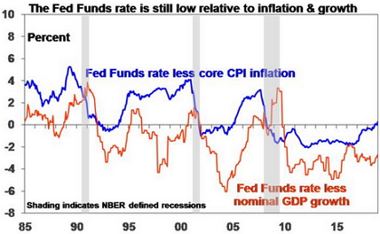 So, while the Fed has raised interest rates since late 2015 it has not slammed the brakes on with tight monetary policy. Past US recessions have been preceded by the Fed Funds rates being well above inflation and nominal growth, whereas that’s not the case now. See the last chart. And given perceived risks to growth and the concern that it will be easier to deal with a rise in inflation than deflation, the Fed is now moving to cut rates again anyway.