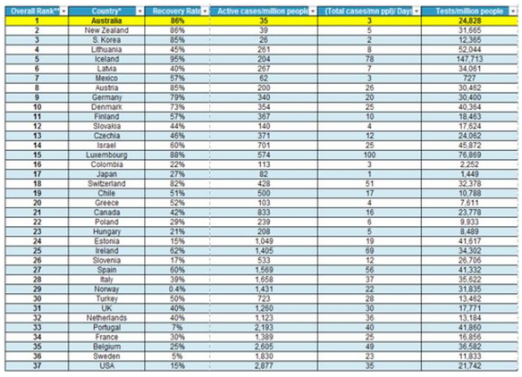 Comparing OECD countries in how they are managing the coronavirus outbreak (based on recovery rates, active cases per capita, total cases per capita adjusted for the number of days since the first case and testing per capita) Australia ranks first, with NZ 2nd (guess where your next overseas holiday might be!) compared to Italy at 28th, the UK at 31st, Sweden at 36th and the US the worst performer in the OECD at 37th.
