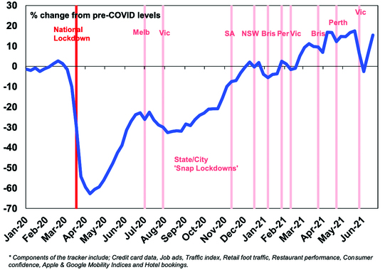 • Snap lockdowns in Sydney, Perth and Queensland are likely to cost the economy $2.5bn, but like previous snap lockdowns are unlikely to derail the recovery.