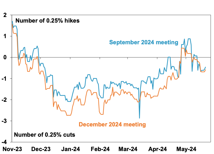 This year has seen a bit of a rollercoaster ride in interest rates expectations – which may be what you would expect at a turning point in the cycle. Early in the year, the money markets had priced in nearly three RBA 0.25% cash rate cuts for this year, with around seven Fed rate cuts. After the March quarter inflation scares in Australia and the US, the money market in the US had scaled back to just 1.5 cuts and the local money market started to price in rate hikes. The last two weeks have seen money markets become dovish again with two cuts priced in by year end for the US and one partly priced in for Australia. The renewed dovishness reflects better April inflation in the US, a less hawkish than feared Fed, a less hawkish than feared RBA, the Budget being seen as neutral, and softer data for local wages and jobs. The minutes from the last RBA meeting confirmed it considered another hike and didn’t consider a cut and it warned that “the risks around inflation had risen”. This suggests the RBA retains a tightening bias. However, its guidance that it’s difficult “to rule in or out future changes in the cash rate” along with its unchanged forecasts for inflation to fall into the target range next year suggest the tightening bias is mild.