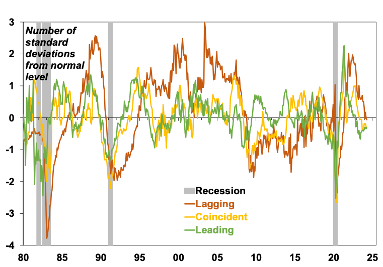 Consistent with this household spending data suggests real consumer spending is flat to negative on a year ago. While the stage 3 tax cuts are worth $1929 a year for those on average earnings, this only offsets a very small portion of the extra $15,000 or so a household with an average mortgage is paying each year so it’s hard to see it causing a big rise in spending. The next chart shows a mix of economic indicators that lead (like building approvals, consumer and business confidence and the yield curve), are coincident with (like employment and retail sales) or lag (like unemployment and delinquency rates) the economy. While none are at recessionary levels and leading indicators have become a bit less negative, both leading and coincident indicators remain below normal levels.