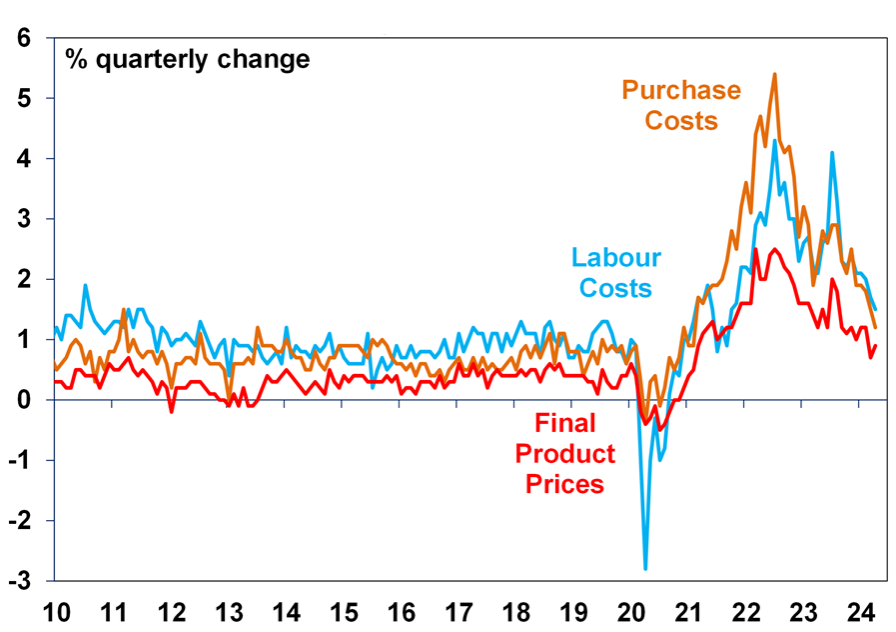 Second, weak demand means inflation is likely to resume its downswing. We have been seeing a quarterly pattern of higher than expected then lower than expected inflation lately which suggests the June quarter could see lower than expected inflation; the Melbourne Institute’s April Inflation Gauge points to a resumption of the falling trend; and similarly the NAB business survey points to a falling trend in cost and selling price inflation.