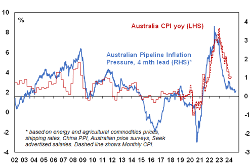 Finally, while the Budget was more stimulatory than ideal, the extra stimulus was relatively modest. The impact on inflation from cost-of-living measures (about 0.5% over the next 12 months) likely means a downwards revision to RBA inflation forecasts. That could result in a potential flow on to underlying inflation measures as various government charges indexed to the CPI go up by a smaller amount and help keep inflation expectations down. So, we have concluded that the Budget did not warrant a change to our prior expectation for inflation to fall to 2.7% by June next year and for the RBA to start cutting rates by year end.