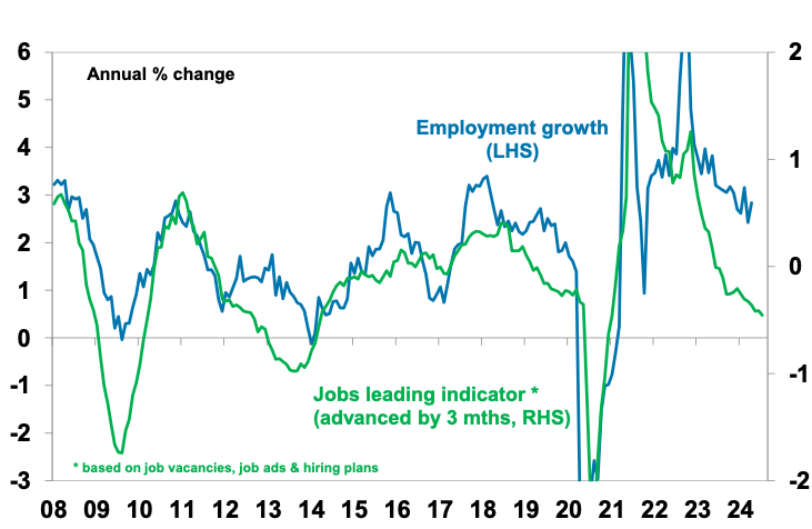 Thirdly, the labour market is cooling, and this points to slower wages growth which will lower services inflation. While the labour market remains tight the trend is up in unemployment & underemployment and falling job vacancies & hiring plans point to slower jobs growth ahead, as evident in our Jobs Leading Indicator which is pointing down.