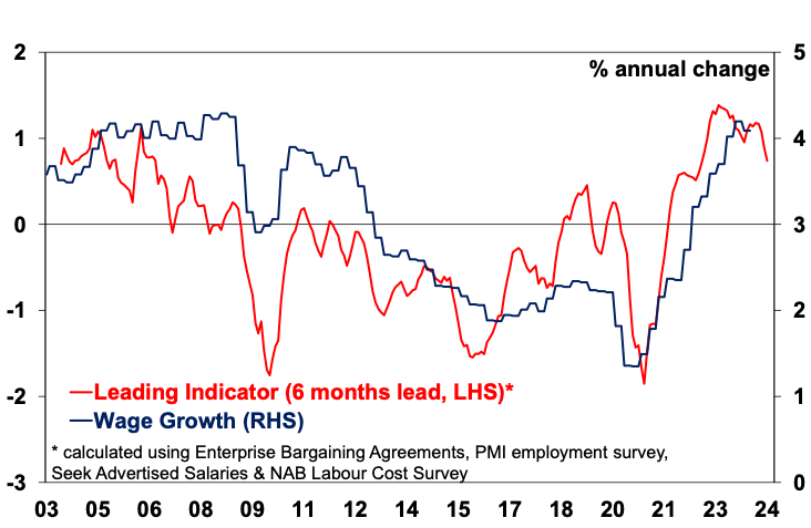Consistent with this our Wages Leading Indicator points to slower wages growth ahead reflecting softer increases in new Enterprise Bargaining Agreements and lower labour cost surveys.