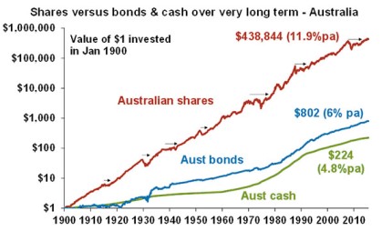 Investors should always be aware of two fundamentals: the power of compound interest and that there is always a cycle. The power of compound interest, which is basically the compounding of investment returns in one year on top of those earned in previous years, is demonstrated in the next chart which shows the value of $1 invested in 1900 in Australian cash, bonds and shares over time assuming that interest and dividends are reinvested along the way.