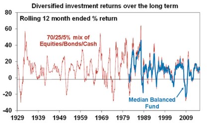 The problem is that there is always a cycle. Cycles encompass both secular malaises like those seen in the 1930s, 1970s and last decade for global shares that can last a decade or so before giving way to better times, and normal business cycles that result in three to five year cyclical swings in share markets. The impact of this can be seen in the following chart that shows returns from a diversified mix of assets back to the 1920s.