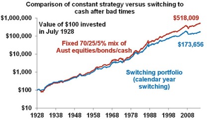 The switching strategy does produce better short term results when there are two consecutive calendar years of negative returns from the fixed balanced mix as in the early 1930s and mid-1970s. However, over the long run it produces an average return of 9% pa versus 10.3% pa for the balanced fund. On a $100 investment in 1928 the switching portfolio would have grown to $173,656 now compared to $518,009 for the constant balanced mix. (It doesn’t look so dramatic in the chart as I have used a log scale because otherwise it would just show two exponential curves.) Over the same period $100 invested in cash would have grown to $11,280 and $100 invested in bonds would have grown to $34,830. Out of interest while the constant balanced mix portfolio is now well above its pre GFC high, the switching portfolio is yet to fully recover.