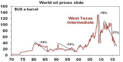 How much further the oil price falls is really anyone’s guess. Oddly enough having fallen 77% from its 2011 high the plunge is similar to past falls after which supply started to be cut back (see the next chart). I suspect we have now reached or are close to the point where, baring a global recession, it will start to become self-limiting but the oil price could still push down to $US20/barrel which in today’s prices marked the lows in 1986 and 1998.