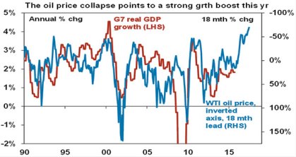 Many of these worries will persist but at some point the positive impact flowing from reduced business and consumer costs will become evident. The historical relationship indicates that the positive impact of lower oil prices and developed country growth takes a while to flow through, with the next chart suggesting the bulk of it is likely to show up this year.