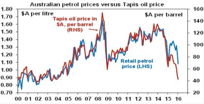While Australia is a net oil importer, it is a net energy exporter which means that to the extent that lower oil prices flow through to oil and gas prices it means a loss of national income and tax revenue. For Australian households though lower oil prices mean big savings. The plunge in the global oil price adjusted for moves in the Australian dollar indicates average petrol prices should be around $0.90/litre (see next chart). While prices haven’t dropped this far – apparently due to high refinery margins based on Singapore petroleum prices – the price at the bowser is still well down on 2014 levels.
