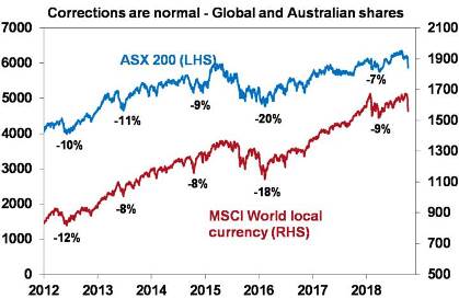 First, periodic corrections in share markets of the order of 5-15% are healthy and normal. For example, during the tech/dot. com boom from 1995 to early 2000, the US share market had seven pull backs greater than 5% ranging from 6% up to 19% with an average decline of 10%. During the same period, the Australian share market had eight pullbacks ranging from 5% to 16% with an average fall of 8%. All against a backdrop of strong returns every year. During the 2003 to 2007 bull market, the Australian share market had five 5% plus corrections ranging from 7% to 12%, again with strong positive returns every year. More recently, the Australian share market had a 10% pullback in 2012, an 11% fall in 2013 (the taper tantrum), an 8% fall in 2014, a 20% fall between April 2015 and February 2016 and a 7% fall earlier this year all in the context of a gradual rising trend. And it has been similar for global shares, but against a strongly rising trend. See the next chart. While they can be painful, share market corrections are healthy because they help limit a build-up in complacency and excessive risk taking.