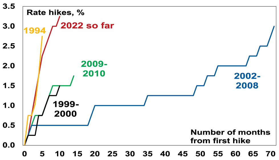 The RBA raised its cash rate by another 0.25% taking it to 3.35%. This is the ninth consecutive rate hike in a row over ten months totalling 325 basis points and exceeds the 2002-2008 tightening cycle (of 300 basis points over 71 months) making it the biggest tightening cycle since the 1980s. Prior to 1990 the RBA cash rate was not officially announced, and short-term rates were very volatile. In the period January 1988 to November 1989 the overnight cash rate rose from 10.6% to 18.2% but mortgage rates were more regulated then and “only” rose from 13.5% to 17%.