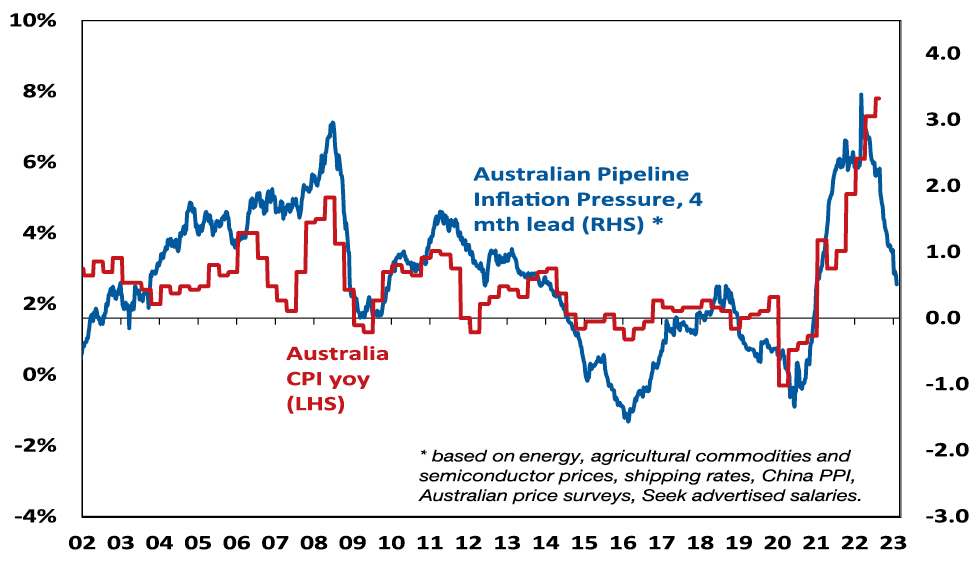 • Third, there are signs Australian inflation is peaking with business surveys showing a downtrend in input and output price readings, low work backlogs & a falling capacity utilisation. Reflecting this and global indicators, our Australian Pipeline Inflation Indicator is falling sharply.