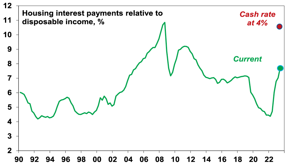 • Specifically in relation to household debt, given the almost three-fold increase in the household debt to income ratios over the last 30 years, a 17% mortgage rate in 1989 – which preceded the early 1990s recession – is roughly equivalent to a 6% variable mortgage rate today and we are already pushing through that. A variable rate borrower on an existing $500,000 mortgage (which is the average) will see roughly another $80 added to their monthly payment from today’s RBA hike which will take the total increase in their monthly payments since April to nearly $1000 a month. That’s an extra $12,000 a year which is a massive hit to household spending power. And roughly two thirds of the 40% of mortgaged households with fixed rates (roughly about 1 million households) will see a 2 or 3 fold increase in their payments when their fixed term expires by the end of the year. And the RBA’s interest rate hikes have now exceeded the 2.5% mortgage rate serviceability buffer that applied up to October 2021 and the 3% since. The surge in interest rates has already pushed mortgage interest payments as a share of household income back to levels not seen since early last decade.  A rise in the cash rate to 4% would push the interest payment share to near a record high and total mortgage repayments (ie, interest and principal) as a share of income to record highs. The hit to spending power for households with a mortgage (who tend to vary their spending more than older Australian’s with big bank deposits) is likely to drive a big slowing in consumer spending.