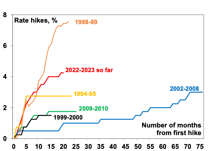 First, while the economy has been far more resilient than we expected when rate hikes started 19 months ago its well known in the words of Milton Friedman that “monetary actions affect economic conditions only after a lag that is both long and variable”. This can be up to 18 months or more. This is because it takes a while for the hikes to be passed through to borrowers and for them to adjust their spending and for this to impact companies and jobs. The experience of the late 1980s in Australia where the cash rate was raised from 10.5% to 18% though 1988 and 1989 but unemployment kept falling, only for the economy to fall into recession in 1990 is a classic example of these lags at work. (Rates were higher then, but the level of household debt to income was one third current levels.)