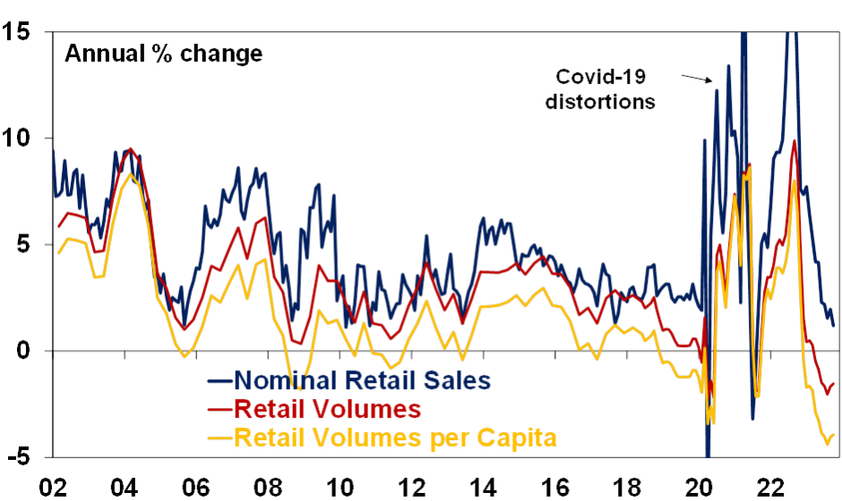The 13 rate hikes since May last year mean that a variable rate borrower with a $600,000 mortgage will have seen around an extra $17,000 a year added to their mortgage payments. Most may have sought a better deal but even if they got a 0.5% discount on their mortgage rate it would now amount to an extra $14,900 in extra mortgage payments. This has already seen housing debt interest payments as a share of household income double from their lows with scheduled total payments rise to a record share of income. It’s hard to see this not having a big impact on household spending. Particularly given the RBA’s analysis based on variable and fixed borrowers that around one in seven households with a mortgage were already cash flow negative in July, which will likely be higher by now.