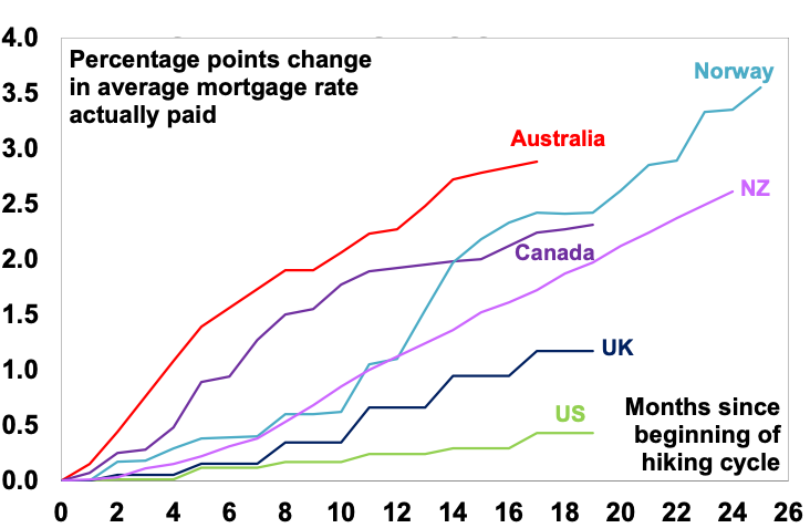 Finally, it should be noted that while the RBA has not raised its key policy rate as much as in other comparable countries (5% in Canada, 5.25% in the UK, 5.37% in the US & 5.5% in NZ), the rise in actual outstanding mortgage rates exceeds that in most other countries (reflecting the higher reliance on short dated borrowing here) implying a much bigger hit to households.