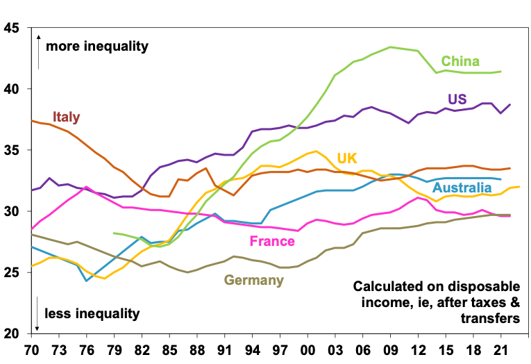 Rising inequality and perceptions of stagnant living standards are big ones. The next chart shows the Gini coefficient, which measures income inequality, calculated on incomes after taxes and transfers. It ranges from zero indicating perfect equality to one indicating perfect inequality with one household/individual receiving all income. As can be seen there has generally been a rising trend in inequality during the past 50 years. Surprisingly, it’s not evident in Italy and France, but is particularly evident in China (despite its socialism), and also the US, UK and Australia. Wealth inequality has also increased. Rising inequality may have been bearable in the 1990s and 2000s as nominal income was rising faster and households took on debt to boost their living standards. But this has become harder.