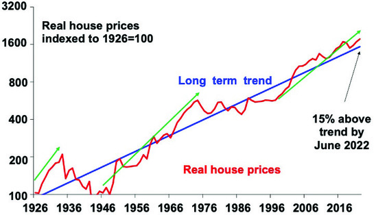 Over the last 100 years real property price growth has averaged around 3% per annum in Australia which out of interest is in line with long term average real GDP growth (which is a rough proxy for long-term income growth). While property prices go through lots of short-term cycles, these are less noticeable when annual data is used as in the last chart. In a big picture context, we can see that real Australian property prices have gone through three major long-term booms (highlighted with green arrows) and two major long-term busts or weak periods over the last century.