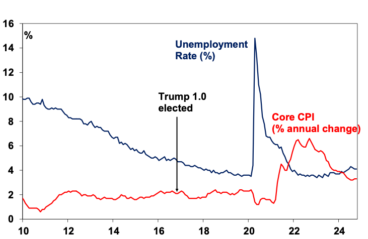 Donald Trump’s US election victory – that saw him win the popular vote (albeit only by 1.7%) with increased support from low income voters, various racial groups, women, the young, etc, with Republican’s having control of Congress – has shocked many. Particularly here in Australia where support for him was always low versus Harris. His detractors – and don’t forget 48.3% of American voters voted for Harris – see him as bad for the environment, diversity/equity and inclusion (DEI), inequality, democracy, the rule of law, global peace and the economy (via bigger budget deficits, inflation and trade wars). Weaker checks and balances this time around – including his inability to run again and more MAGA loyalists in his team suggesting a quick move to implement his policies – are seen as adding to such concerns. On the environment and DEI, it’s hard to argue otherwise as a majority of American voters have clearly put the economy ahead of the environment and DEI. But the old-fashioned “hip-pocket nerve” dominating in times of economic stress is nothing new – with the main issue in the US (Australia and elsewhere) being the rise in the cost of living and the fall in real wages over the last 4 years.