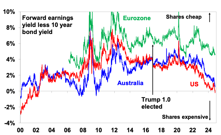 - This means US shares are now offering a zero-risk premium over bonds: the gap between the earnings yield using consensus expected 12 months ahead earnings and the 10-year bond yield was around 3% when Trump was elected in 2016, but it’s now slightly negative. It’s a similar story for Australian shares but at least it’s still positive. Similarly, Eurozone shares are now less attractive than in 2016, albeit they offer far more attractive valuations than US shares do.