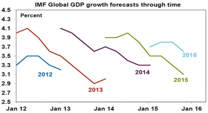 A defining feature of the economic cycle we are now going through is the constrained and fragile nature of economic growth globally. After an initial bounce post the GFC to 5.4% in 2010, global economic growth has consistently disappointed. This can be seen in the progression of the IMF’s economic growth forecasts for each year since 2012. Typically the IMF has started off looking for global growth close to 4% for the year ahead but each year has had to revise it down to around 3%, pushing the 4% bounce off into the next year. This year has been no exception – see the line for 2015 in the next chart.