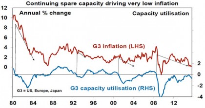 • Low interest rates. Over the long term, interest rates roughly line up with nominal economic growth. And for good reason. If real economic growth and inflation are high, nominal rates of return on investment are high and so too are interest rates and vice versa. So if inflation and real growth are low, so too should be interest rates. But there’s another factor: when economies are operating below full capacity and inflation is below target, interest rates need to run below nominal growth to hopefully boost growth and use up spare capacity. This is exactly what we have been seeing since the GFC and continue to see now. So while many simply say “low interest rates are due to central banks” the reality is that they reflect low nominal growth and spare capacity. It’s hard to see this ending soon.