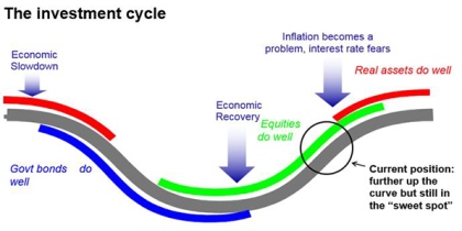 First some context. The next chart is a stylised version of the investment cycle – the thick grey line is the economic cycle.