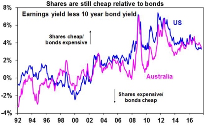 The key to watch for the next big bear market is for signs of excess – eg, overinvestment in key areas, rapidly-rising inflation, aggressive tightening in monetary policy, clear overvaluation and investor euphoria. This would then set the scene for the next economic downswing and hence a more severe bear market (as opposed to a correction or short-term bear market like we saw in 2015-16). At the moment, it’s hard to see much excess but we do expect US inflation to start rising from here. One risk is that the longer things remain benign, the more investors will expect them to remain benign and this will result in excessive risk taking setting up the scene for a sharp fall in markets. But it’s only lately investors have started to get comfortable. So this may have further to go.