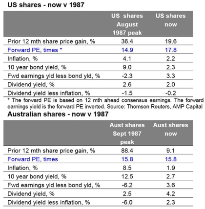 October 19 marks the 30th anniversary of the 1987 share market crash and as always comparisons are being wheeled out. While the bulk of the crash was concentrated in October 1987 (US shares fell 20% on October 19 and Australian shares fell 25% on October 20), US shares fell 34% over three months and Australian shares lost 50% over two months. The causes remain subject to debate – but the key appears to have been a 3% rise in US inflation, a 2% rise in US bond yields and Fed tightening hitting markets after a period of very strong gains. The following tables provide a brief comparison to today.