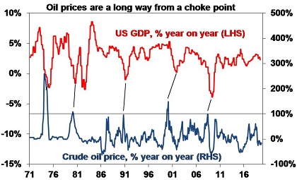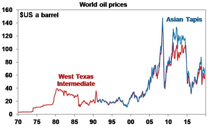 It’s not so much the oil price level that counts as its rate of change, as businesses and consumers get used to higher prices over time. Trouble normally ensues if the oil price doubles over 12 months. From where we were last week at around $US55 for West Texas Intermediate this would imply a rise to around $US110 a barrel (more for Brent and Tapis) and right now at around $US62 a barrel we are nowhere near that.