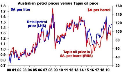 As can be seen in the next chart, Australian petrol prices track the Asian Tapis oil price in Australian dollars pretty closely because our prices are largely set globally (absent the GST, fuel excise, distribution costs and retailer margins). So spiking world oil prices will flow though to Australian motorists. Prior to the attacks in Saudi Arabia, Australian capital city petrol prices were around $1.40 a litre. The rise in oil prices since then implies a rise to around $1.46 a litre. This is not great for those of us who have cars, but would still see average petrol prices below the levels seen last October.